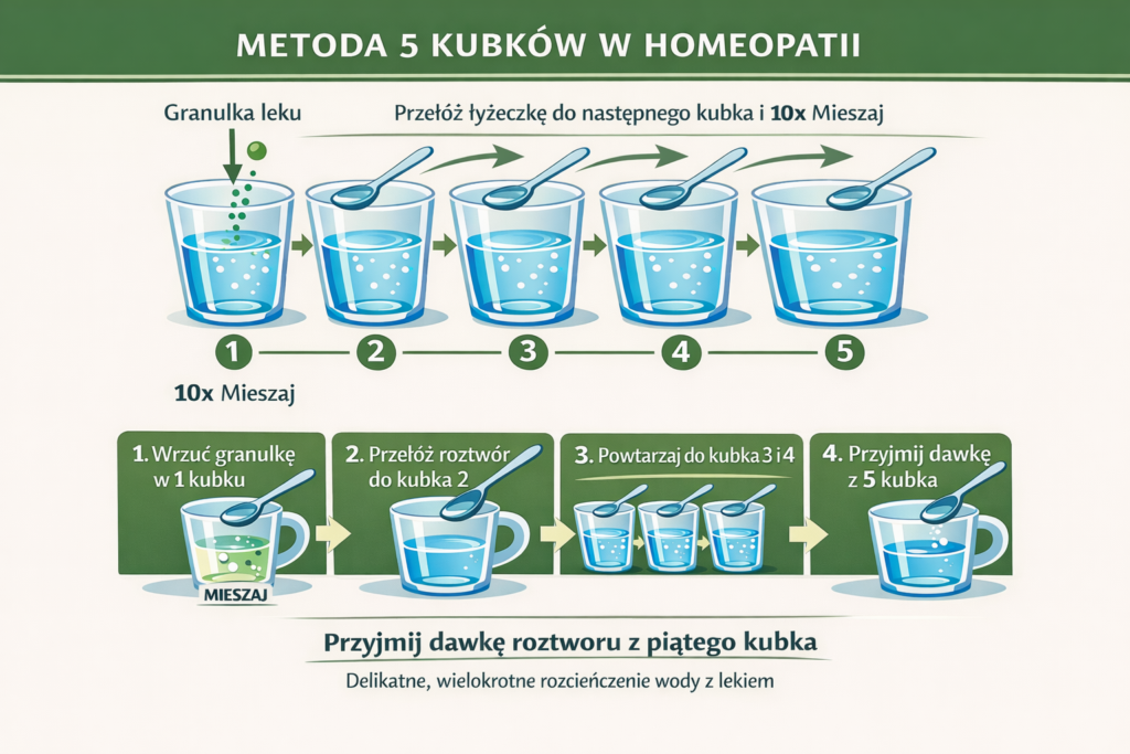 Metoda 5 kubków polega na wielokrotnym rozcieńczaniu leku homeopatycznego w wodzie przed jego przyjęciem.